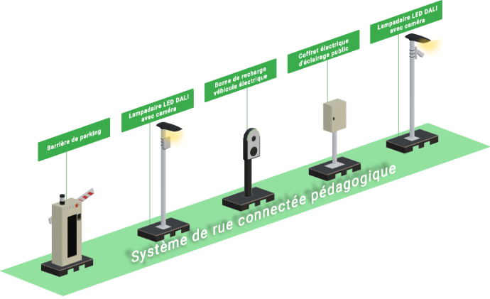 Intégré à la Rue Connectée Pédagogique DEC, le coffret devient un maillon d’un écosystème de formation : interaction avec lampadaires LED, borne de recharge, vidéosurveillance, borne Wi-Fi… Les élèves développent des compétences en électrotechnique, automatisme, mesure, diagnostic, supervision énergétique et communication IP, tout en travaillant en situation globale (dépannage, mise en sécurité, analyse fonctionnelle).